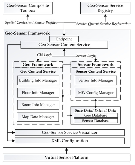 In Figure 3, we present the detailed configurations diagram for the proposed geo-sensor framework module interactions for multiple platform deployment. A geo-sensor framework offers a main service of geo-sensor content service. The geo-sensor content service has logical implementation for sensors involved in the network and geographical context of the sensors provided by sensor content service and geo content service, respectively. The sensor content service offers a sensor information manager and sensor’s middleware configuration manager. The geo-sensor framework has a virtual sensor platform at one end, from where the sensor network’s information is passed to the framework. It creates the sensors networks’ profiles using the geo-sensor composite toolbox, which is later also visualized to the client end for client-level updates. Each time a service is created at the geo-sensor framework, it has to be registered at the geo-sensor service registry to maintain each sensor network’s detailed history log. The geo-sensor framework eventually deploys the multiple geo-sensor platforms for multiple networks by mapping each of the network’s information to its respected platform using the geo and sensor content services, geo-sensor composite toolbox, and geo-sensor service registry.