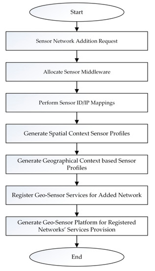 Figure 5 depicts the flowchart for the generation of the geo-sensor platform. Firstly, the sensor network addition request is made by the client. Once the sensor addition request is made, the middleware allocation to the sensors involved in the network is done. The physical sensors ID mappings are done to the virtually generated IPs. Next, the spatial context profile for each sensor involved in the network is created. The spatial context-based profiles include the sensor model and type information as well as the sensor’s geographical information. After creating the profiles, the content services are registered at the service registry, and, finally, the geo-sensor platform for the added sensor network is deployed, along with the services provision, at the client view.