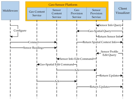 Figure 6 shows the sequence diagram for geo-sensor service provision based geo-content service, sensor content service, geo provision service, and content provision service. The sensor data is passed onto the content service via sensor middleware. First, the middleware configurations are performed, and then sensor readings, after a certain interval, are sent to the sensor platform. The client query regarding sensor network is passed onto the sensor provision service under a geo-sensor platform, and the client query regarding the spatial context of the sensor is passed onto the geo provision service in the geo-sensor platform. The edit queries from the client are passed onto the content service, which interacts with the geo-sensor toolbox and performs the edit operations and sends a response back.