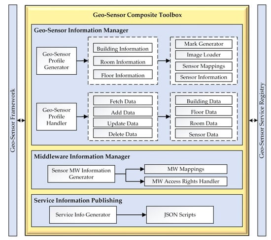 The geo-sensor composite toolbox has a vital role in the overall system. It provides the basic functionalities, which enable the client to add a sensor network along with its’ geo-spatial context and also manages the network remotely. It has three functioning sub-modules as geo-sensor information manager, middleware information manager, and service information publishing (Figure 7). The geo-sensor information manager generates the spatial contextual based sensor profile for the sensor network and creates the geo-sensor profile handler for the content services access in the geo-sensor framework. The middleware manager generates the middleware mapping information for each sensor platform and creates the access handler for the geo-sensor framework. Service information publishing generates the service scripts for each added sensor network.
