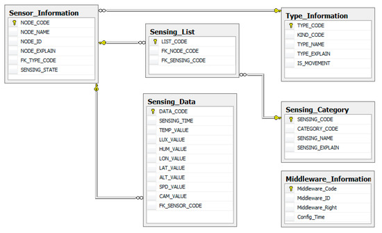 Figure 8 shows the sensor database entity relationship diagram. In the sensor database, we have sensor information, sensor type information, sensing data, sensing list, sensing category, and middleware information. Sensor_Information table saves sensor information. Sensing_List table saves the sensor’s sensing type. Sensing_Category table saves detailed information about sensing type. Type_Information table saves the sensor’s type. Sensing_Data table saves sensing data.
