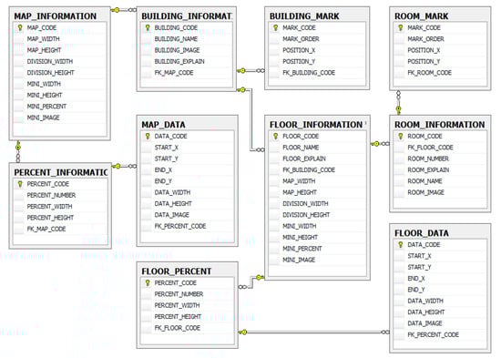 Figure 9 shows the geo database entity relationship diagram. In the geo database, we have map information, map percent information, map data, building information, building mark, floor information, floor percent, room information, and room mark. Map_Informaiton table saves total map information (map size, minimap, minimap size, etc.). Percent_Information table saves the percent image information for the total map image (10%–100% reduced total map image size information). Map_Data table saves the total map image data. Building_Information table saves building information. Building_Mark table saves building area information. Floor_Information table saves floor map (map size, minimap, minimap size, etc.). Floor_Percent table saves the percent image information for floor map image (10%–100% reduced floor map image size information). Floor_Data table saves floor map data. Room_Information table saves room information. Room_Mark table saves room area information.