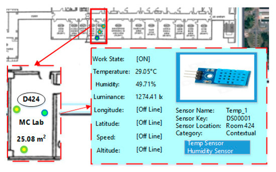 Once a geo-sensor platform is selected, as shown in Figure 10c, the client can either view its geographical based sensor details or head to the composition toolbox. Figure 11 shows the spatial context-based visualization of installed sensors at the selected geographical location. Once the client selects onto a specific sensor placed at a specific location onto the map, the client can view detailed sensor information, such as sensor name, sensor key, sensor location, sensor work state, and the sensor’s current readings.