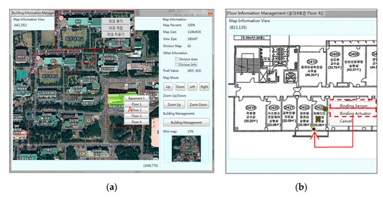 Figure 12 shows the geo-sensor composite toolbox execution screen for building information management (Figure 12a) and floor information management (Figure 12b). The composition toolbox enables services for making changes, such as the addition of new sensors network, deletion of sensor or map data, or updating of sensor or map data. Figure 12a shows the building information management screen where the client can get overall building information, such as building map information or the building’s floor information. In order to navigate to a particular floor, the client would select the floor number from the building map, as shown in the highlighted region A in Figure 12a. After selecting the floor number, the client would navigate to the floor information management, as shown in Figure 12b. Within floor information management is detailed room-wise floor information along with available sensors in each room. Upon clicking a room, the client would get the option to bind a sensor onto the selected location. On clicking the binding sensor option, the client would navigate to the execution screen shown in Figure 12c. The client can bind a new sensor at the selected spot or delete/update an existing one.