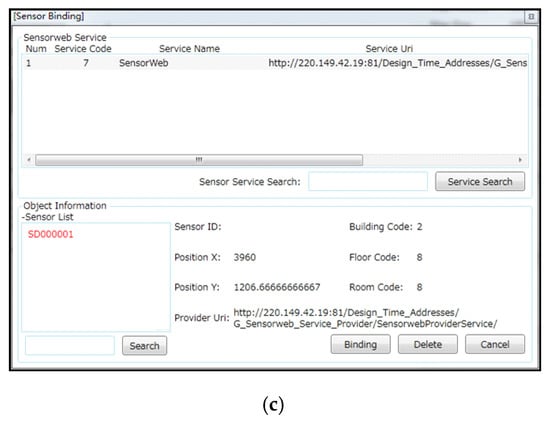 Geo-Sensor composite toolbox execution screen: (a) building information management; (b) floor information management; (c) sensor binding.
