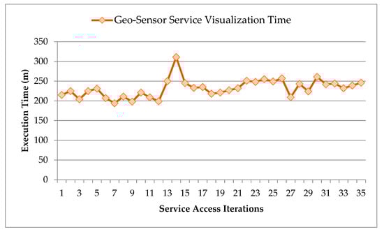 In Figure 13, we evaluate the connection request response time from the geo-sensor framework for selected geo-sensor service visualization. The service visualization will load the geo-sensor network with a loading site map along with the sensors list, details, and available controls. In order to test the geo-sensor service access and visualization response time, multiple access attempts are made to the service. It takes around 231.74 ms to access the service visualization, which seems to be a reasonable amount of time for the proposed scenario.