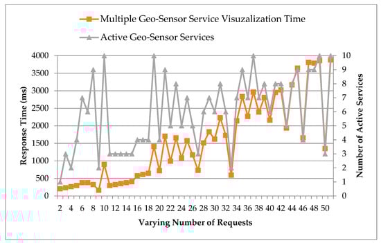 Now, we test the response time for multiple services access by multiple users at the same time to evaluate the system performance under-load scenario. Figure 15 presents the comparison of the connection request response time made from multiple users to access multiple services at the same time. The service access and visualization have to be loaded for multiple requests simultaneously in this scenario. We have evaluated multiple geo-sensor service access with a varying number of requests and varying number of active services. In the graph below, we can clearly observe that as the load of access requests and active sessions increases, the delay in responses the system witnesses, and, hence, the response time also increases. In our performed evaluation scenarios, the maximum execution time under 51 requests and 10 active users turn out to be around 3880.63 ms, and the average response time for the system under varying load scenarios turn out to be 1558.16 ms. Hence, the system response time under the worst load scenarios have delays up to a maximum of around a little less than 4 s, and on average, with varying load scenarios, remains around 1.5 s. We can safely say that the overall system performance under varying loads is tolerable, considering system service load requirements.