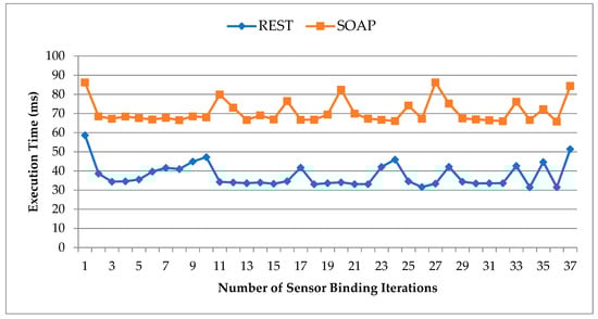 In Figure 16, we present the comparison results for geo context-based sensor binding process between RESTful and SOAP implementations. It shows the time taken in order to bind a sensor object onto a geographical location in the specific position of the given map. We can observe a clear difference and decrease in the execution time taken by the RESTful based services as compared to SOAP, which proves the RESTful based implementation to be better in the given scenario.