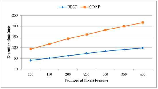 In Figure 17, we present the map navigation query’s response time comparisons based on pixel movement between the REST and SOAP implementations of the proposed framework. Each time the client navigates the map view, new blocks of maps are loaded depending on the move. It shows the comparison of the experiment results for loading the map move data from the geo sub-module and sensor data onto the moved location from the sensor sub-module. The data from the geo sub-module and the sensor sub-module are loaded via the geo-sensor platform and deployed by the geo-sensor framework. Every time, both the protocols, SOAP and REST, are tested with the same interval of move operation as a move of 100 pixels, 150 pixels, 200 pixels, 250 pixels, 300 pixels, 350 pixels, and 400 pixels. The results in response to each move operation for both the web services implementations are recorded in terms of the response time by the geo-sensor platform. The results clearly show that REST based web services outperform the SOAP based web services.