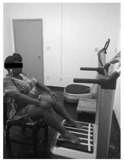 WBVE involves exposing individuals to mechanical vibrations that are produced in a vibrating platform (VP). These vibrations are transmitted to the body of the individual that is in contact with the base of the VP. Some parameters must be adjusted (frequency, peak-to-peak displacement, and peak acceleration) considering the clinical condition of the individual []. Similarly, if the person is sitting on an auxiliary conventional chair [] or wheelchair [] with the feet on the base of VP, the individual will also experience WBVE.