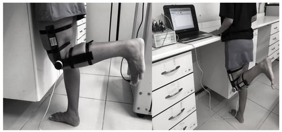 A standard digital goniometer (EMG 830RF, EMGSystem®, São Paulo, Brazil) was used to measure the active ROM [,,] of the knees during flexion from extension. The goniometer was properly fixed on the skin with tape on the lateral side of the knee joint, alternately right and left, to measure the flexion angle. Knee angles related to ROM were recorded on a computer. These procedures are shown in Figure 3.