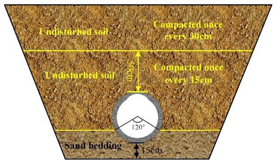 Foundation pits were backfilled with undisturbed soil and medium–coarse sand. The sand bedding, which was laid and compacted using medium–coarse sand with particle size <25 mm, was laid around the bottom of the pipe at a level of 120° subtended below the springline. Bed compaction was 92% ± 3%, and depth was 0.15 m. The rest of the foundation pit was backfilled with undisturbed soil. A line of soil 0.5 m above the top of the pipe was used as a separator; fill was compacted once every 15 cm below the line and once every 30 cm above it. The cross-section of pipe bedding is shown in Figure 2. The material parameters are shown in Table 1.