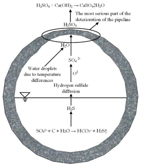 Erickson [22] found that corrosion within buried concrete pipelines is caused mainly by hydrogen sulfide gas in the pipeline. The process is: Sulfate ions in the sewage inside the pipeline are reduced to hydrogen sulfide by the action of anaerobic bacteria; hydrogen sulfide, which escapes to the inside wall at the pipe crown, is oxidized to sulfite molecules and sulfuric acid molecules under the action of sulfur bacteria [23]; sulfuric acid molecules then dissolve in the water droplets, due to temperature differences, producing sulfuric acid; consequently, the inside surface of the concrete pipe, which was originally alkaline, gradually becomes neutral and forms a bean curd-like watery gypsum layer under the long-term action of sulfuric acid. The chemistry of the corrosion process on the inside of pipe wall is: