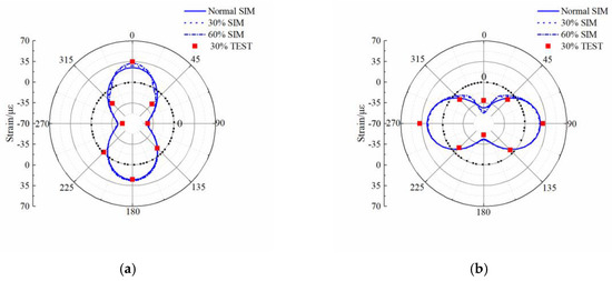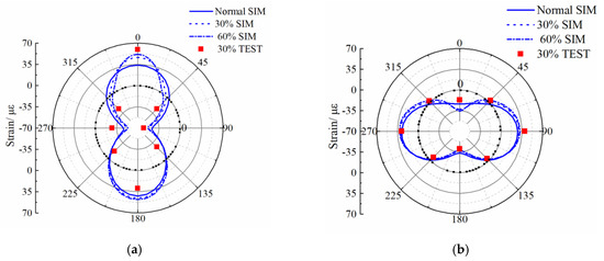 Buco et al. [31] inspected an 1800 km sewer network and found that 26.7% of concrete pipe defects were related to joint displacements or openings. Therefore, we examined the mechanical properties of the pipe joint for different corrosion depths. Circumferential strains (the distribution of strain around the pipe circumference) on the inside and outside of the P2 bell and P3 spigot walls for different corrosion depths were calculated and the result was compared with the values obtained from the experiment (Figure 10 and Figure 11 ). In the figure, SIM represents the model data and TEST represents the experimental data.