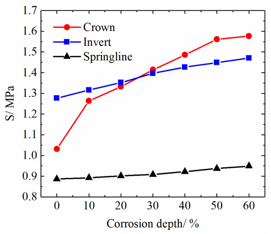 Pipes are prone to crack under long-term operation, affecting the normal operation of the pipeline. To explore the relationship between the risk of the pipe cracking and corrosion depth, corrosion depths of 10%, 20%, 40%, and 50% were calculated. The maximum principal stress in ABAQUS is the maximum value of the direct stress on the section in different directions at a point. Damage to the concrete, which has typical brittle characteristics, can be judged by the maximum principal stress and use of the four major criteria of material failure. It is assumed that the concrete pipe will crack along the longitudinal direction when the maximum principal stress is greater than the ultimate tensile strength of the concrete. Thus, the maximum values of the maximum principal stress at the crown, the springline, and the invert were determined to represent the relationship between the risk of the pipe cracking and corrosion depth (Figure 12).