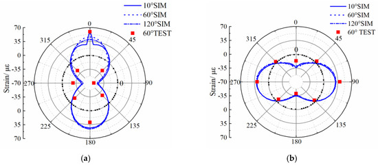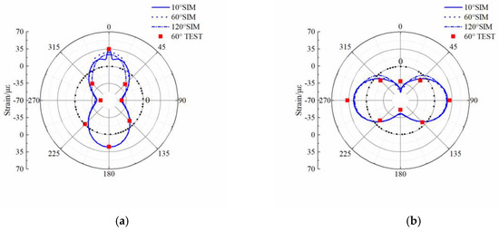 Figure 16 and Figure 17 show that the numerical simulation results are consistent with the full-scale test results. The circumferential strain of the inside and outside of the pipe wall under different traffic loads are coincident at the 45–225° and 135–315° diameter regions. However, circumferential strain at other pipe locations (crown, springline, and invert) increases as traffic load increases. We conclude that under traffic load, pipe deformation occurs mainly at the crown, invert, and springline, and that deformations at the 45–225° and 135–315° diameter regions of the pipe are extremely small.