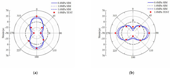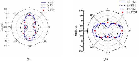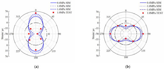 Figure 10 and Figure 11 show that the model values and distributions of circumferential strains are consistent with the experimental results. The relative error is <25% at the crown, the invert, and the springline, but the relative error at the 45–225° and 135–315° diameter regions of the pipe is relatively large, in the range 25%–40%. The reasons for this difference are that the 45–225° and 135–315° diameter regions of the pipe are less stressed than other locations, the observed values at these positions are small, and the sensitivity to error is greater. Thus, the relative error at the 45–225° and 135–315° diameter regions of the pipe is correspondingly greater. The relative error was calculated using Equation (3):