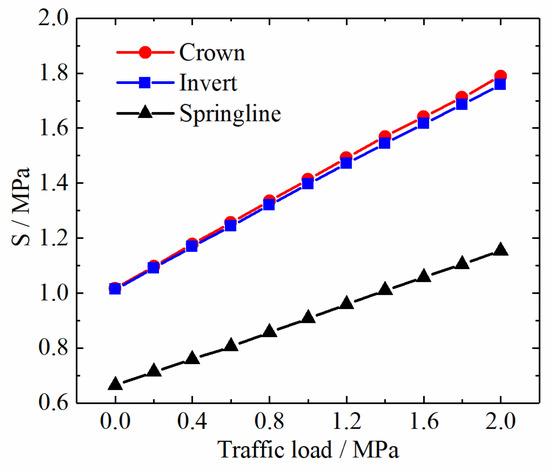 Traffic load values of 0, 0.2, 0.6, 0.8, 1.2, 1.4, 1.8, and 2.0 MPa were calculated to investigate the effect of traffic load on pipe cracking. As in Section 4.1, the maximum values of the maximum principal stress at the crown, the springline and the invert under different traffic loads were extracted and analyzed (Figure 18).