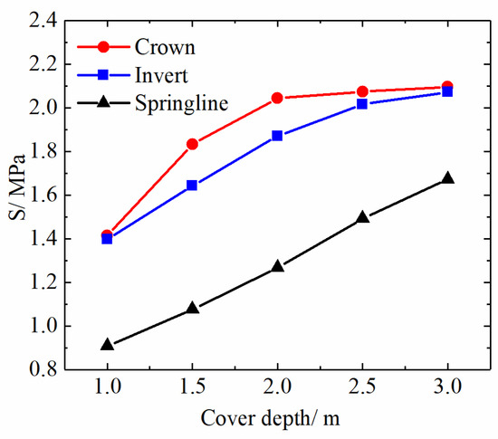 Cover depth values of 1.5 and 2.5 m were calculated. As in Section 4.1, the maximum values of the maximum principal stress at the crown, the springline and the invert under different cover depth were extracted (Figure 21).