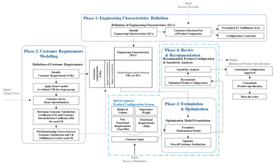 This study proposes a novel quick-response product configuration system that could generate an optimal product configuration to maximize customer satisfaction under a budgetary constraint. A new product configuration system was established based on the proposed design model (as shown in Figure 2) that insists of four phases, namely: (1) Engineering characteristics definition; (2) customer requirements modelling; (3) formulation and optimization; (4) review and recommendation.
