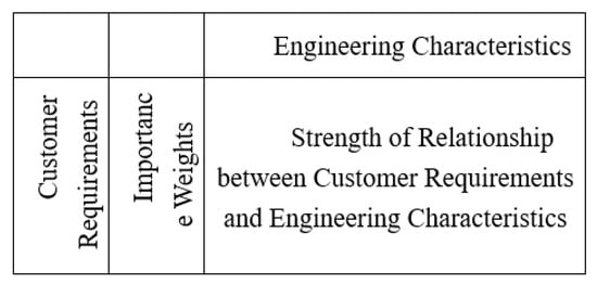 Customer requirements of a product refer to the judging criteria in customer evaluation []. Marketing experts help to identify the CRs to be involved for the product. Then, an investigation is performed to classify the CRs into several types. Based on the investigation result, CS could be mathematically expressed by the fulfillment level of each CR and integrated into the optimization model. The ID of each CR is recorded. QFD is implemented to construct the house of quality (HOQ) [], which is the main representation to show the relationships between ECs and CRs. A typical HOQ is shown in Figure 3.