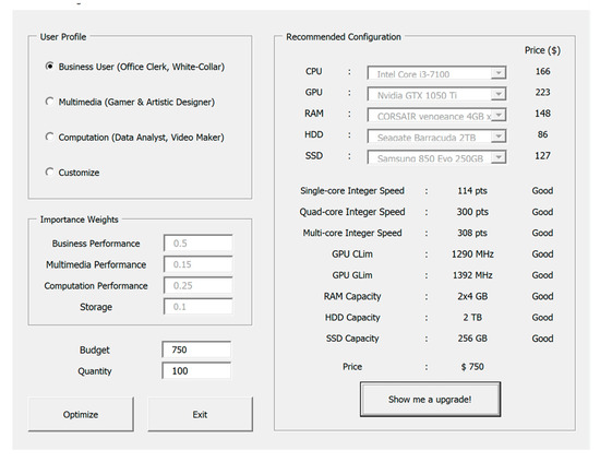 To construct the selection pool for primary functional ECs, reference data is obtained from UserBenchmark (http://www.userbenchmark.com/), which is a platform that tests and evaluates thousands of PC components with millions of benchmarks and votes. The price list of the parts for CPU, GPU, RAM, HDD, and SSD are explained in Appendix A (see Table A1, Table A2, Table A3 and Table A4).