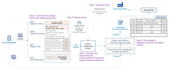 How a company responds in the new environment and how their resources are to be distributed to optimize production and product transactions within their capability are serious issues []. It is vital for companies to directly collect dynamic user requirements and make wise decisions in a short period of time. It is expected that a configuration system could benefit companies by transforming customer voice into configurations. However, existing configuration systems are not likely to adapt well to the potential of Industry 4.0 and meet the dynamic customer requirements. Currently, a typical strategy of customization named make-to-order (MTO) is providing selections of subassembly to customers to configure the products themselves and then place their orders [,]. MTO is a business production strategy allowing consumers to purchase products that are customized to their specifications. It is also a manufacturing process in which the production of an item begins only after a confirmed customer order is received, otherwise known as mass customization [,]. An MTO manufacturer starts to work on an order only after it has been placed by the customer. MTO is characterized by back orders with zero inventories as each customer order is unique and cannot be manufactured in advance. Consequently, the main driver in MTO operations is the new transformation under Industry 4.0 about customer orders [,]. In view of the various products and changing demand, companies adopt MTO and quick response manufacturing (QRM) strategies to be able to respond quickly to user demand through the quick design and production of products. Quick response (QR) is a management concept created to increase consumer satisfaction by shortening the lead time from receiving an order to delivering the product, increasing the cash flow. In this process, manufacturers do not actually hear from customers directly but only receive the orders they place []. Yet, customers may not know whether their choices will satisfy their needs, and manufacturers may provide insufficient selections without knowing what customers really need []. In addition, the focus is largely on developing product configuration models to transform fixed, collected customer requirement data into high volume and specific specifications, which fails to consider the practical condition of dynamic, customized order placement from online customers.