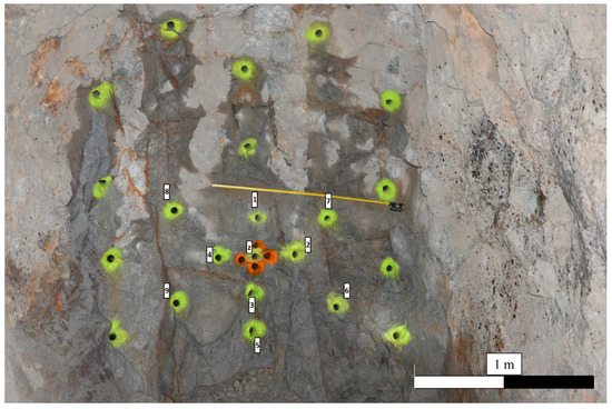 Drilling mesh on the blast face. Numbers indicate the firing sequence (“z” indicating zero). Light green: charged holes, orange: dummy holes. The metric scale is visible.