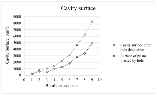 Although irregular, the cavities formed followed the mechanism of the ejection of prisms, at whose extremities lay the detonated hole and the extremes of the previously created free surface. The surface of each cavity created (corresponding to the surface of the prism ejected) was measured using software image analysis (Plot digitizer v. 2.6.8—Free Software Foundation, Inc., 59 Temple Place—Suite 330, Boston, MA 02111-1307, USA) via pictures with a scale metric reference. Results are shown in Figure 3, which plots the evolution of the surface of the cavity formed by each hole along the experiment.
