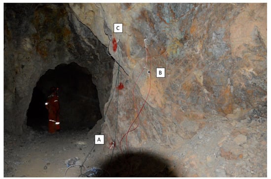 Shock measurements were realized using three low-cost, easy-to-install piezoelectric shock sensors. The sensors were installed as close as possible to the blast face, while taking the precaution of installing them around the first corner in order to avoid damage from projected fragments. Sensors were installed at three different heights, and on three different sets of joints of the rock mass, roughly perpendicular among themselves, as shown in Figure 4. One of the advantages of the shock sensors was their rather low sensitivity and therefore the capability to capture a signal at a very high amplitude, avoiding the kind problems related to the saturation of the recording device. The adopted sensors were verified with a rather accurate response in the frequency range between 5 and 500 Hz, which was suitable for the vibration blasting recording. The average sensitivity of the sensor was approximately in the range of 10–15 mV/mm∙s.