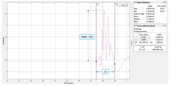 Figure 5 shows a typical reading of the response of a shock sensor. The values considered, being the voltage peak and the duration of the oscillation, are highlighted. The duration of the oscillation was measured by filtering out the noise that was readable after the clean waveform of the real shock oscillation.