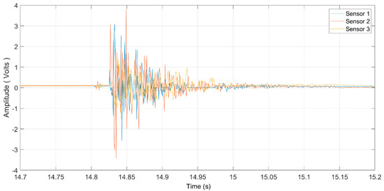 Considering only the peak-to-peak voltage, sensor C showed a shock behavior that was drastically different from the other two.