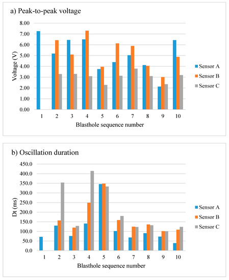 (a) Peak-to-peak recorded voltage for the blasthole sequence number. (b) Oscillation time for each blasthole sequence number; sensor C systematically measured lower peak voltages but for a longer duration of the oscillation.