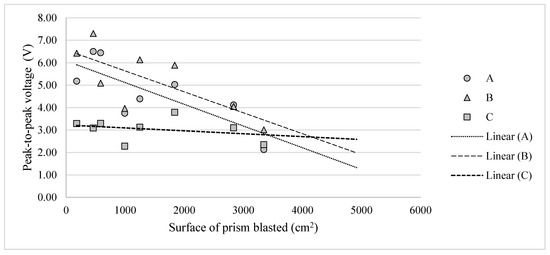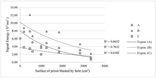 Equation (1) gives the value of shock energy. Figure 10 shows the energy plotted against the surface of the blasted prism of each hole. In this case, the disparity between the measurements of sensor C versus the other two sensors disappeared; by combining the displacement component and the time component of the shock measurement, it normalized the behavior of the sensors’ responses. It is still visible that there was a clear reduction of shock with an increase of the available free surface. It must be noted that Figure 9 and Figure 10 show only eight measurements out of the ten blasted holes. This is because the first hole in the burn cut did not generate a visible cavity (the rock was not ejected), and the last measurement registered outlying values, probably due to fragments ricocheting and hitting the rock in proximity to the sensors, exciting them out of scale.