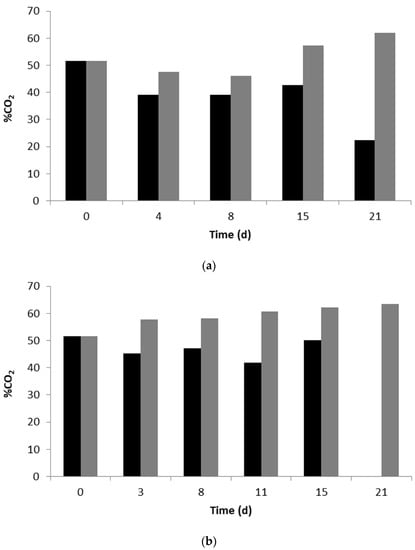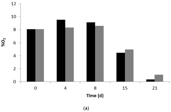 With regard to the O2 concentration, it showed a descending trend (Figure 2), while at the end of the storage period, the O2 concentration exhibited zero levels, which was related to the increased microbial population of the total viable counts, for both MAP and ACT-MAP gutted sea bass samples (p > 0.05; no statistically significant differences between ACT-MAP and MAP samples for most cases).