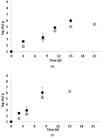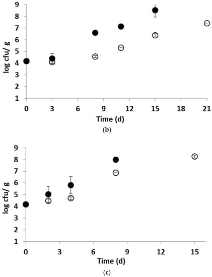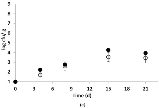 Lactic acid bacteria (LAB) counts remained well below the spoilage level of 6.0 log CFU g−1 [17], increasing with the storage time–temperature increase. Both ACT-MAP and MAP samples presented similar LAB growth behavior (Figure 6). No mathematical modeling of LAB growth was performed. It was concluded that the CO2 concentration in the package headspace did not present a statistically significant effect on LAB in MAP and ACT-MAP samples (p > 0.05) [20,33]. Turan and Kocatepe [29] reported that the initial LAB count was 2.03 log CFU g−1, and no more than 4.91 log CFU g−1 was measured using different packages.