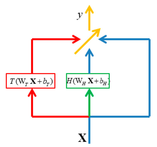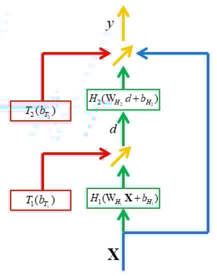 Based on the idea of the output of T(WTX+bT) the utility of input x and the output of the transform H(WHX+bH) can be compared. The proposed dynamic high network (DHN) is expressed as Equations (10) and (11), and it is shown in Figure 3: