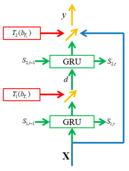 In DHNs, the neurons are used as the normal nodes. There is no recurrent ability in the nodes, so they are unable to cope with temporal characteristics. In GRU-based DHNs, the neurons in the two sublayers are replaced with the GRU model to extend the model’s ability to address human behavior. Moreover, we use gates and in this model, with the same purpose as the forget gate in the LSTM model. This sublayer structure is intermediate between the GRU and the LSTM models.