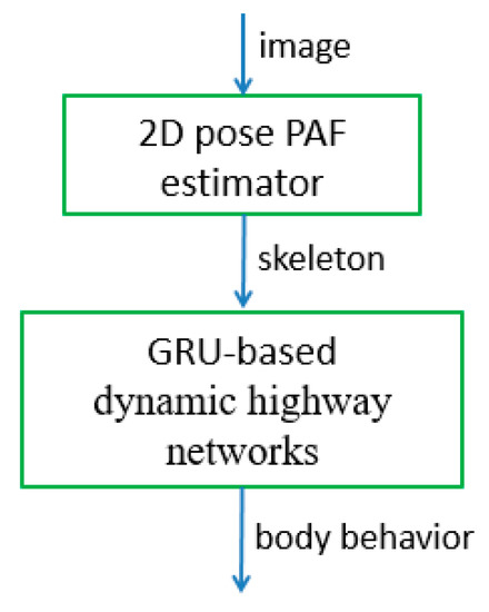 As a result, the new model combining the 2D pose estimator using PAF and GRU-based DHNs is used to perform human skeleton estimation first, followed by behavior recognition, and it is shown in Figure 5. In other words, the 2D pose estimator using PAF first determines the 2D positions of the body joints; then, a GRU-based DHN is constructed to estimate human behavior from the movements of the body joints with time.
