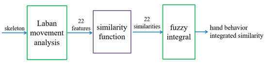 The similarity value of the LMA features extracted from two similar hand behaviors is high. When the behavior resembles the recording behavior, the Euclidean distance is close to 0 and the similarity value is close to 1. Conversely, the similarity value is close to 0. After using Equation (13), the 22 similarity values of 22 features are obtained. In order to speed up the system and collect more gestures as possible, we use a fuzzy integral to fuse 22 features instead of using a model to identify what kind of behavior, and the fusing result is the final similarity value.