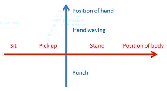 As shown in Table 1, we choose seven representative daily highly repeated behaviors, namely, standing, walking, running, sitting, punching, hand waving, and picking up. In this study, we regard people as pedestrians if they are walking or running. Although the behavior cognitive map connects behavior with location, the behavior of pedestrians is not relative to their locations because they simply want to move toward their destination. For this reason, pedestrians are neglected in the behavior cognitive map. The remaining representative daily behaviors can be separated into two dimensions: the body and the hands. In the body dimension, standing, sitting, and picking up denote different body positions. In the hands dimension, punching and hand waving denote different hand positions.