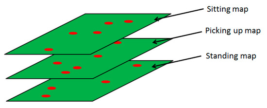 The behavior cognitive map is divided into three maps—sitting, picking up, and standing—because it is impossible for these three states to occur simultaneously. As one of these behaviors occurs, the behavior of the body is predicted, and the features of the behavior of the hands are calculated in accordance with the definition of body behaviors above. These features are recorded in the behavior map where the body is in the corresponding position. These maps are illustrated in Figure 8.