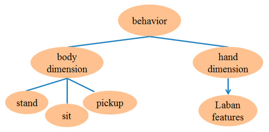 The red dots indicate that features are recorded at those locations. Thus, the behavior cognitive map is defined, and it can record the relationships between behaviors and the locations at which they occur. Therefore, a behavior can be decomposed into the body dimension and the hand dimension. In the body dimension, three body behaviors (standing, sitting, picking up) represent the body behavior. In the hand dimension, LMA is employed due to the large number of possible hand behaviors. The model structure is shown in Figure 9.
