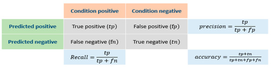 An F-score set is created to express the reliability of each model for a positive class. In the F-score set, each F-score serves as a measure to judge the evaluation of a model. Two parts are considered for calculating the F-score—precision p and recall r. The precision p expresses the proportion of correct estimates of a positive result among all positive estimations. The recall r expresses the proportion of correct estimates of a positive result among all correct estimations. The detailed calculation is shown in Figure 10.
