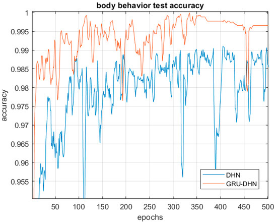 The test results are shown in Figure 11 and summarized in Table 3. In Figure 11, DHN denotes DHNs and GRU-DHN denotes GRU-based DHNs. The GRU-based DHNs exhibit superior behavior-recognition performance, with accuracy exceeding 99.5%.