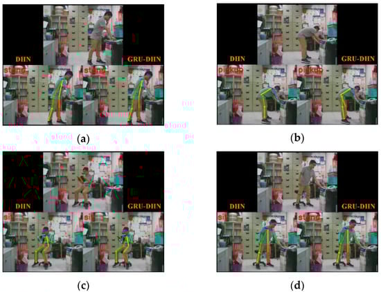 In Figure 12d,f, the original images show obviously the participant stand, and the GRU-DHN recognizes correct prediction as stand, but the DHN recognizes the wrong result as sit. The above results show that the temporal characteristics contribute to the identification of body movements. For this reason, GRU-based DHN can effectively improve classification performance. As a result, the GRU-based DHNs are selected to recognize body postures.