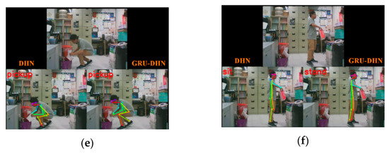 The following series of figures show the results of online continuous testing, which illustrate this inference. Figure 12 shows continuous frames extracting from a video and each panel shows three sub-images (Figure 12; see the video for Supplementary Materials S1, https://youtu.be/oHLd-O9n_Og). For each panel, the top sub-image shows the original image captured using the camera. The bottom-left sub-image shows the skeleton predicted by the DHN. The bottom-right sub-image shows the skeleton predicted by the GRU-based DHN. For example, in Figure 12a, the original image shows the participant stands. The predictions of body posture for two different classifiers are stand. It shows that both classifiers can be recognized correctly. Figure 12b,c,e also show the same situation. However, some moments indicate distinct situations.