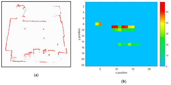 The behavior cognitive map is constructed with many blocks. Each block represents an area measuring 30 cm × 30 cm in the real world, and the behaviors occurring in this area are recorded in the same block. In this experiment, the robot constructs behavior cognitive map for an exhibition. The size of the room used in experiments is 700 cm × 700 cm. Figure 13 shows the physical map obtained with laser points and the behavior cognitive map. The physical map is shown in Figure 13a. The physical map only records the spatial relation to locate the robot, static objects, and participants. The red points represent the static objects, and the blank space represents the space people can walk. According to the physical map, the robot can only know the range of the visitors’ activities.