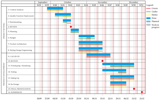 Furthermore, every task always has some deadlines, so everything is determined starting with them and with the expected results. In this way everyone, in each moment, could schedule his tasks agreed in advance, and this way allow the whole design process to be very efficient. This tool also enables people to be aware of the consequences of possible delays; in these cases, it is possible to resize the time assigned to the further tasks.