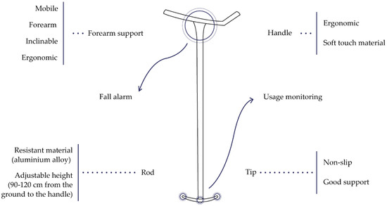 From the What-How Matrix (Table 4) it resulted that the three features to innovate were: tip, adjustable height and material. Furthermore, there have been added innovative features, thanks to the use of sensors for usage monitoring and fall alarm.